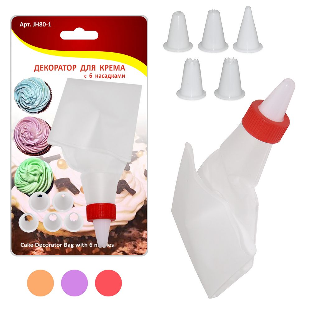 Декоратор представляет собой комплект, состоящий из кондитерского мешка и насадок. Мешок изготовлен из винила (ПЭВА), его объем 350 мл, насадки производятся из пластмассы. Приспособления идеально подходят для домашнего использования – просты в применении, занимают мало места, нетребовательны в уходе. Винил и пластмасса полностью безопасны, предназначены для многоразового использования.